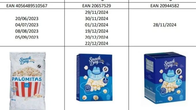 Las palomitas de maíz contaminadas con este pesticida se comercializan bajo la marca Snack Day, y en el cuadro que veréis a continuación, podéis ver el EAN del producto, así como la fecha de caducidad que tienen los lotes de palomitas afectados. Así que si tenéis uno o varios paquetes de palomitas en el formato mencionado y con la fecha de caducidad que veréis a continuación, absteneos de consumirlos.