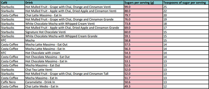 Sobre estas líneas podéis ver las 20 bebidas del estudio con mayor contenido en azúcar, nueve las comercializa Starbucks, ocho la franquicia Costa Caffee, dos la cadena de comida rápida Kentucky Fried Chicken, y una la franquicia de cafeterías británica Caffe Nero. A través de este enlace (Pdf) podréis consultar el listado completo, para más información sobre la investigación, os recomendamos acceder a la página oficial de Action on Sugar.