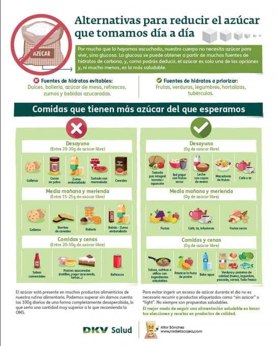Bajo estas líneas podéis ver la mencionada infografía titulada ‘Alternativas para reducir el azúcar que tomamos día a día’, y en la que Aitor Sánchez alerta sobre más cuestiones interesantes para todos, por ejemplo, ¿qué hay de cierto en esa creencia de que hay que comer algo de azúcar para proporcionárselo al cerebro, que la necesita? Pues nada, lo que se necesita es glucosa, y ésta se puede obtener de diversas fuentes de hidratos de carbono naturales y saludables, como la fruta.