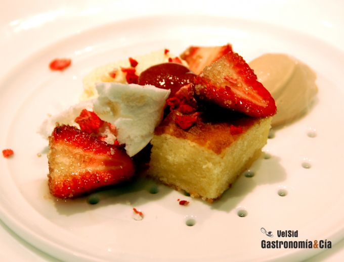 Además de una quenelle de helado de vinagre, presenta este plato para que llegue al comensal con un sugerente aroma a rosas, con hielo seco y esencia de rosas.