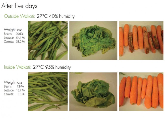 Esta especie de refrigerador se concibió para aumentar la productividad desde la perspectiva de la conservación y no de la producción. ¿De qué sirve producir más comida si no se puede conservar e irremediablemente empezará a descomponerse poco después de realizar la recolección? Conservar los alimentos es tan importante como producirlos y a partir de esta idea se gestó el proyecto Wakati, un sistema de conservación que sólo necesita una pequeña cantidad de agua, nada más. En este sentido, sería interesante recordar que la organizción independiente IMechE (Institución Profesional de Ingeniería), dio a conocer un informe en el que concluía que se podría reducir el desperdicio alimentario en los países en vías de desarrollo si estos países contaran con equipos de refrigeración adecuados.