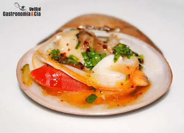 La almeja de concha fina, almejón de sangre o lluenta (Callista chione), es un molusco de buen tamaño, con una concha grande, gruesa y pesada, y una carne muy gustosa. Con ellas hemos preparado un aperitivo sencillo, fácil y rápido de hacer, pero su sabor es exquisito, siempre que se sirva el aderezo en proporciones que nuestro paladar encuentre armónico. A continuación os explicamos cómo aderezamos estas Almejas de concha fina con cilantro y lima.