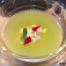 Para compensar esa untuosidad y grasa de la crema de hígado de rape picante, nada mejor que una ligera gelatina de apio (por medio kilo de apio licuado añade 50 gramos de azúcar y un agente gelificante como puede ser la cola de pescado o el agar agar), ésta debe napar la crema, y además unos dados de manzana verde. En el fondo del plato se sirve la crema de hígado, sobre él la gelatina de apio y se termina con los dados de manzana verde y una flores para decorar.