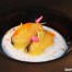 El emplatado es sencillo y elegante, como base sirve la sopa de coco, es muy cremosa, la dispensa con biberón. Seguidamente sirve el tomate confitado picante, ligado con agar agar, sobre éste coloca los mejillones y un poco de su agua de cocción con un punto de curry y espesado con xantana.
