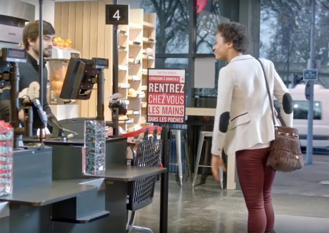 Monoprix presenta su nueva propuesta, muy similar a la de Amazon, pero no se necesitan el teléfono móvil, una aplicación o una cuenta electrónica donde realizar el cargo, además ofrece la ventaja adicional de que la cadena puede llevar la compra al domicilio en menos de una hora y sin tener que pagar nada por este servicio. La cadena francesa explica que han aprendido sobre las necesidades que tienen sus clientes y han aplicado la tecnología humana para satisfacerlas, el cliente sólo tiene que elegir los productos colocarlos en el carrito y llevarlo a la zona de pago e irse.
