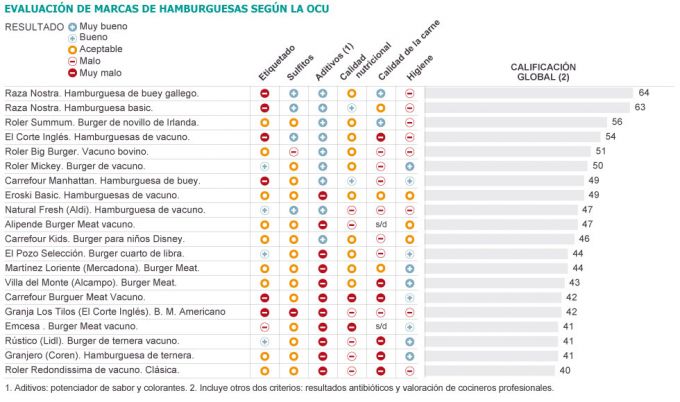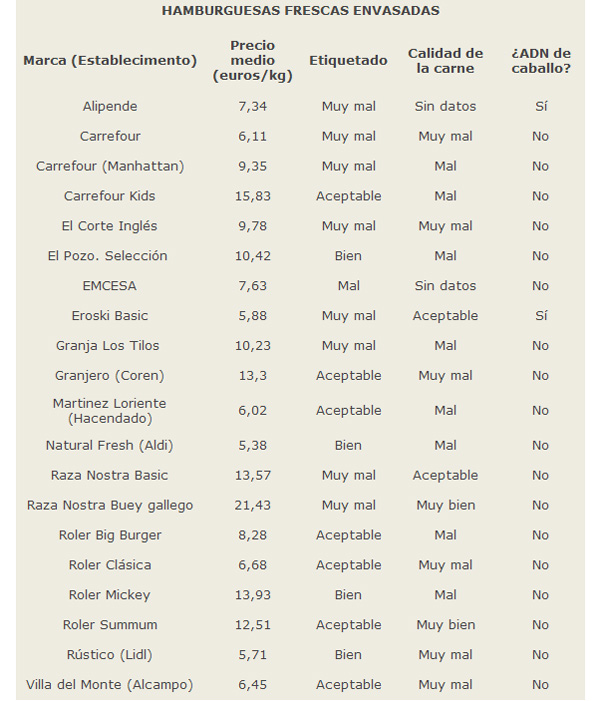 Abundan las hamburguesas con un etiquetado deficiente, pero también abundan las hamburguesas de mala calidad, resulta más fácil mencionar las que son aceptables (que no quiere decir que sean buenas), como las de Eroski Basic pero que contienen carne de caballo, y las de Raza Nostra Basic. Las hamburguesas de mejor calidad son las de buey gallego de Raza Nostra (pero claro, el precio del kilo supera los 20 euros, sólo faltaría…), y las de Roler Summum (a 12’50 euros).