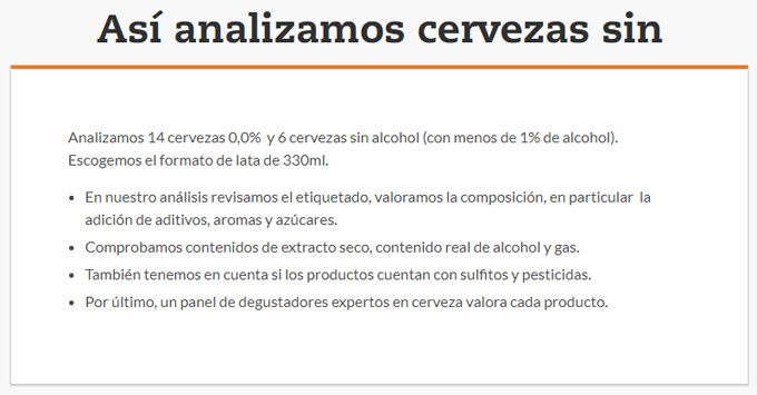 Además, han valorado si las cervezas contenían sulfitos y pesticidas, y un panel de catadores expertos en cerveza ha realizado su trabajo para valorar las muestras por sus propiedades organolépticas. En total se han puesto a prueba 20 cervezas, 14 cervezas 0’0% y 6 cervezas sin alcohol (con menos de 1% de alcohol). Y es que, por si alguien todavía no lo sabía, la cerveza “sin alcohol” tiene un pequeñísimo porcentaje de alcohol, la cerveza que no tiene nada de alcohol luce en su etiqueta el “0’0%”.