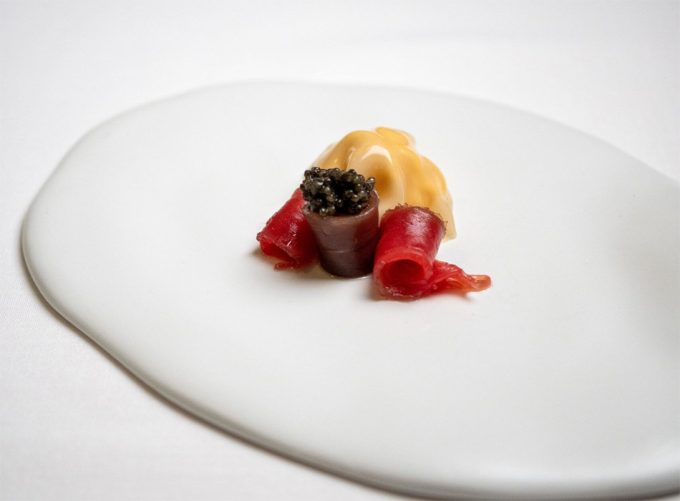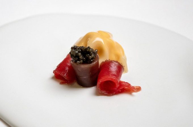 Pero, atentos, que como podéis leer, la anchoa está entrecomillada, eso significa que es una ‘falsa anchoa‘ o que se trabaja el atún rojo intentando emular a la anchoa. No llega a ser un trampantojo porque la presentación no engaña al ojo, pero el chef del restaurante El Círculo de Avilés, Javier Rico, prepara una magnífica pieza de atún curada y aromatizada con aceite de anchoa. Lo mejor es que vosotros mismos veáis la receta de ‘Anchoa’ de atún rojo con espuma de calabaza, velo de horchata y caviar, es un bocado de lujo.