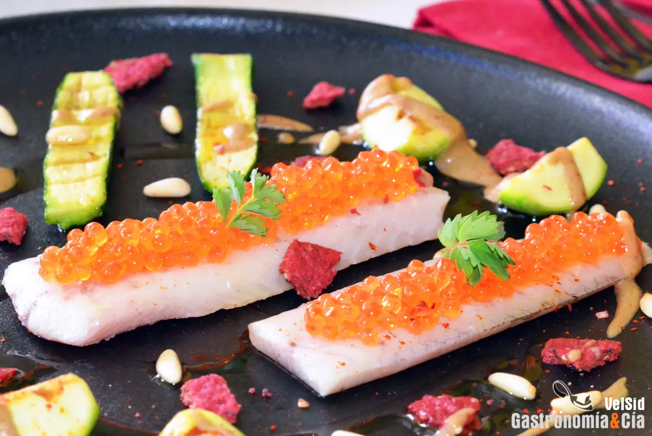 Sirve la anguila ahumada en los platos y coloca sobre ellas las huevas de trucha, con generosidad. Reparte en los platos el resto de elementos de forma armónica, cómo más te guste, los calabacines, los tomatillos, el queso fresco, los piñones, un hilo de aceite de oliva virgen extra y la vinagreta ahumada. Añade también un poco de sal sobre los calabacines y, opcionalmente, una tosta fina y crujiente rota para contrastar texturas y colores. ¡Buen provecho!