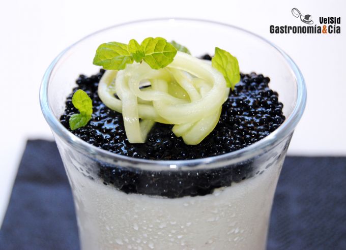 Panacota de queso, huevas de lumpo y pepino