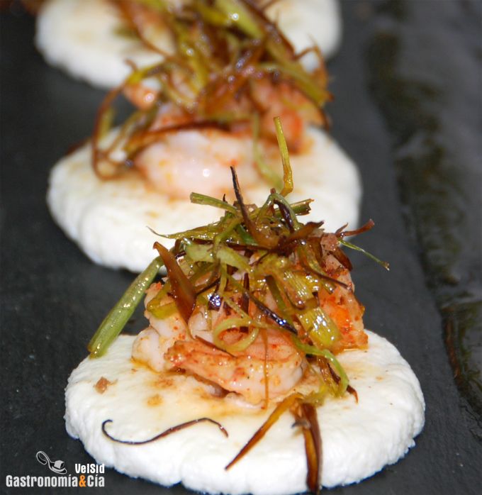 Requesón tostado con langostinos y crujiente de puerro