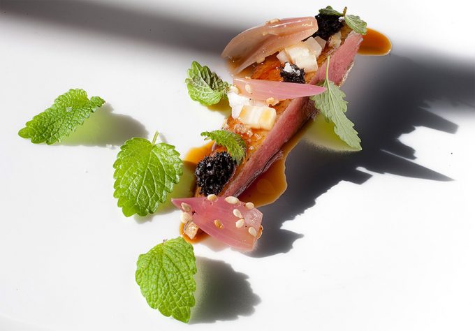 Hoy nos adentramos en Navarra para acceder a la cocina de una remodelada casona de Urdániz, que está dirigida por el cocinero David Yárnoz, creador de experiencias gastronómicas en las que se puede disfrutar de los productos de la huerta navarra y de otros productos de primera. Un talento especial para dominar las técnicas culinarias tradicionales y de vanguardia, y una creatividad elegante y sorpresiva, salen de las manos del chef del Restaurante El Molino de Urdániz (1 estrella Michelin) para ofrecer platos como el que podéis ver sobre estas líneas, se llama Apio, pato, melisa y encurtidos.