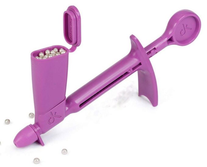 Pues bien, esta delicada tarea tenía que tener una solución para hacerla más fácil y rápida, y se presenta como podéis ver en la foto que encabeza este post, es una especie de pistola que ha diseñado la marca Dragéekíss y se define como un aplicador de perlas para tartas y pasteles. Al final de estas líneas también podréis ver un vídeo en el que se muestra cómo se utiliza y se puede apreciar lo fácil que es de utilizar.