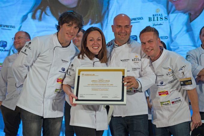 El menú ganador de este certamen, el creado por Aroa López constaba de Clotxina, jabugo y granizado de pomelo rosa como entrante, Glasa de yema del bosque, cabrito y carnaroli a la piedra como plato principal, y Amaretto de café y cacao, pepino, espárrago verde y lima kaffir como postre. La cocinera trabaja en el Restaurante Samsha de Valencia (de chef Víctor Rodrigo, lo recordaréis, quizá, por participar en Top Chef), es segunda jefa de cocina y parece ser que no lleva más de dos años dedicada a la cocina.