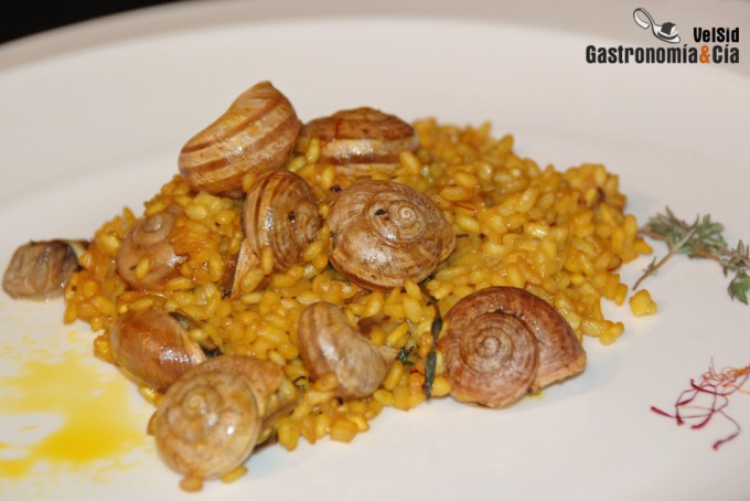 Servir en cada plato una ración de arroz con calamar y disponer por encima una docena de caracoles serranos.