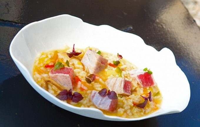 Servir el arroz caldoso en platos hondos. Repartir los dados de atún recién marcados y decorar con las hojas de shiso mini.