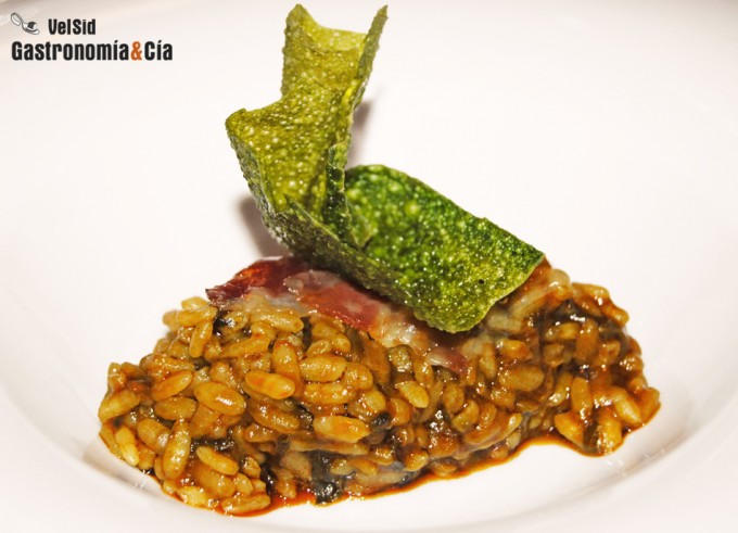 Servir el arroz con acelgas y papada, decorar con la teja de acelga.