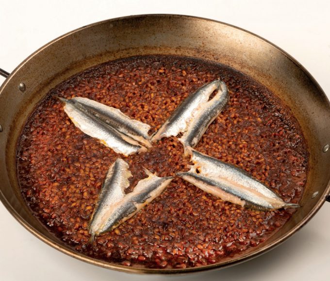 Sacar del horno, poner los boquerones victorianos en mariposa y dejar dos minutos a fuego lento para que el caldo termine de evaporarse, se cocinen los boquerones y aparezca el socarrat.
