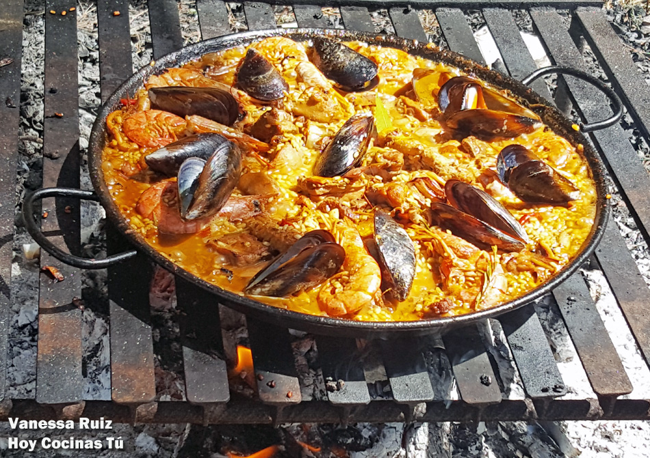 Para hacer el arroz, usar una paella de 38 centímetros de diámetro. Añadir el arroz bomba, el aceite, seis cucharadas de salmorreta y 1’5 litros de fondo de pescado de roca. Poner a hervir y cuando lleve dos minutos meter la paella en el horno para terminarlo a 240ºC durante nueve minutos.