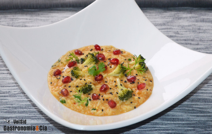 Es una receta muy fácil de hacer, se puede preparar en media hora y os aseguramos que sorprenderá a todos. Se trata de una especie de arroz caldoso o meloso (según cuánto se reduzca) que elaboramos con arroz aromático, en este caso basmati. También añadimos algunas especias, un buen caldo vegetal casero, leche de coco, brócoli al vapor y para provocar una explosión fresca y con un interesante contraste de sabor, incorporamos unos granos de granada. Esperamos que os animéis a probar esta receta de Arroz aromático con leche de coco, brócoli y granada, si queréis darle un toque picante, no dudéis en añadir un poco de pasta de curry o simplemente alguna salsa de chile.