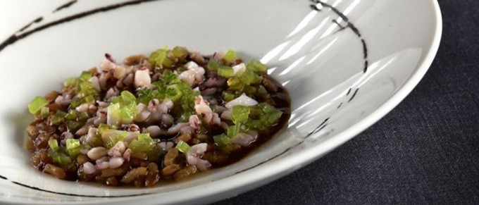 Saltear el resto de los txipis y colocar sobre la piperrada. Decorar con perejil picado, brunoise de pimientos y unas rayas de salsa tinta.