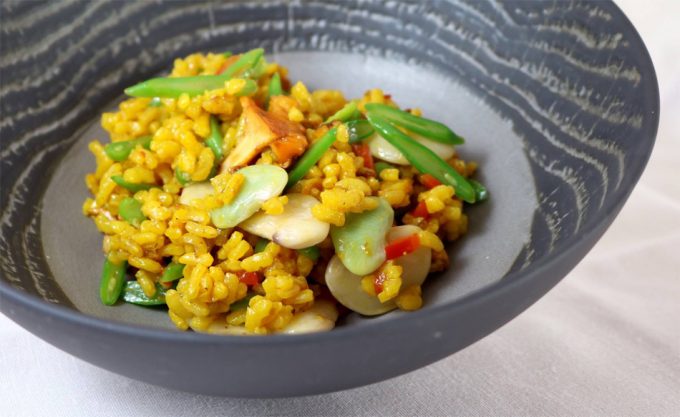 Esto no es una paella de verduras, es un arroz al estilo de Alicante, o mejor dicho, al estilo de María José San Román, chef del Restaurante Monastrell de Alicante, reconocido con una estrella Michelin. En su carta contempla distintos tipos de arroces con distintas variedades de este cereal, en este caso elabora este arroz de verduras y setas con arroz bomba de Calasparra. Os recomendamos a todos tomar nota de la receta de Arroz integral con rebozuelos y garrofón de María José San Román, pues además de poder cocinar un plato nutritivo y delicioso, vais a ver cómo extraer lo mejor de cada ingrediente.