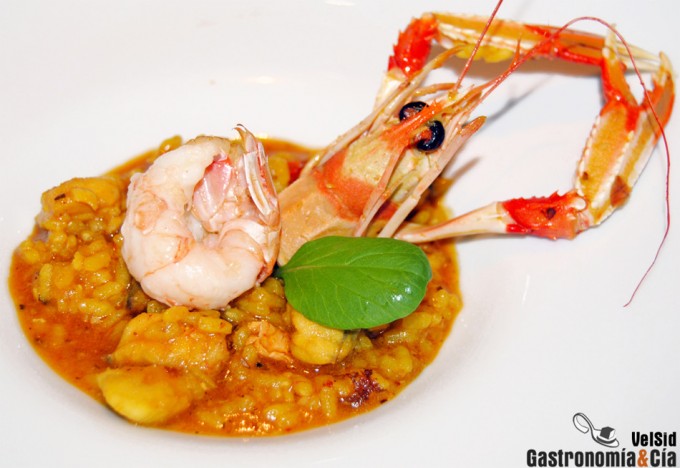 Servir el arroz de rape y cabracho en plato hondo, coronando con el pescado y marisco reservado.