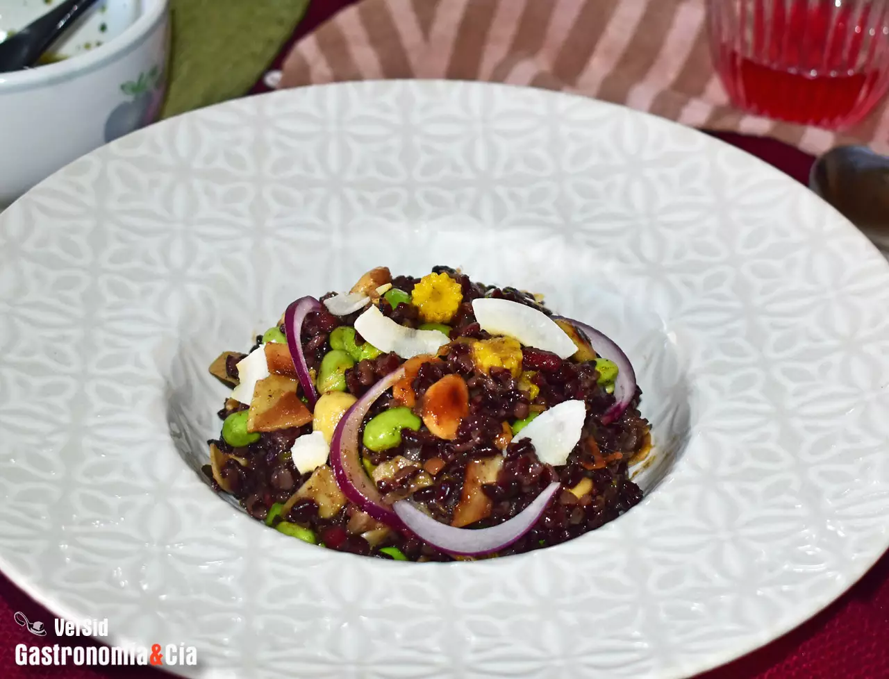 Incorpora el arroz venere que estará cocido y seco, sin caldo. Moja con cuatro cucharadas del aderezo y saltea un par de minutos. A continuación, retira del fuego y añade la cebolla morada, mezcla y deja reposar un minuto.
