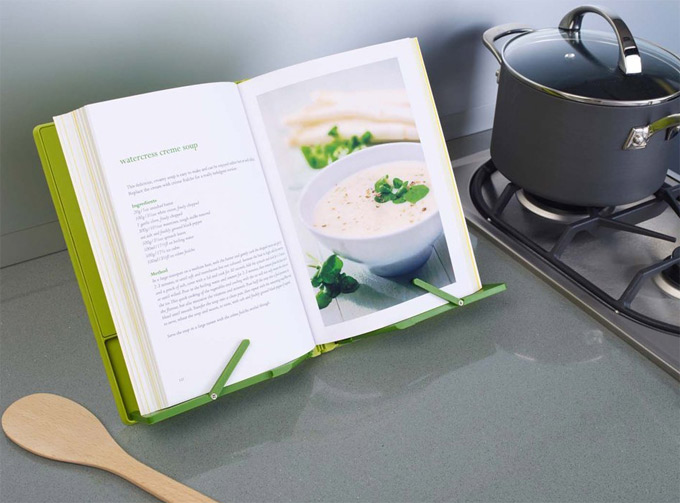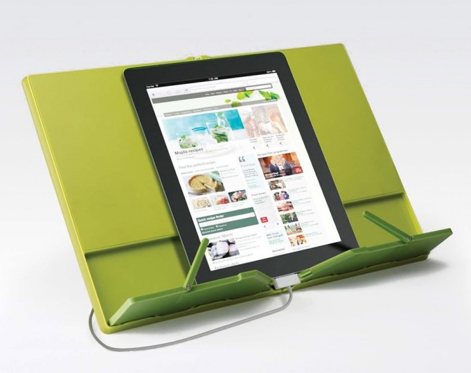 Con los tablets no habrá problema, pero con los libros de cocina la cosa cambia, pues los hay que son grandes y necesitan un soporte mayor, para estos casos hemos encontrado el CookBook de Joseph Joseph, un atril grande para libros o tablets que está pensado para la cocina.