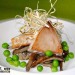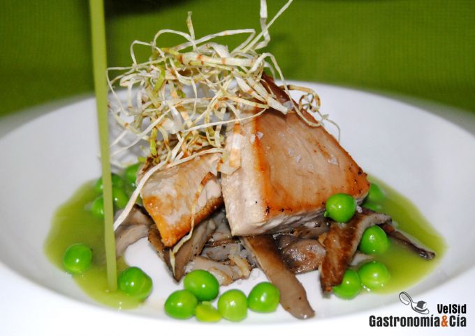 Como base del plato presenta las setas, sobre ellas coloca dos cortes de atún, reparte los guisantes, el crujiente de puerro y si lo deseas, añade un poco de sal Maldon en el pescado y unas gotas de aceite de oliva virgen extra al conjunto. Sirve el Atún con guisantes a los comensales, y ante ellos, termina el emplatado vertiendo el jugo de las vainas. ¡Buen provecho!