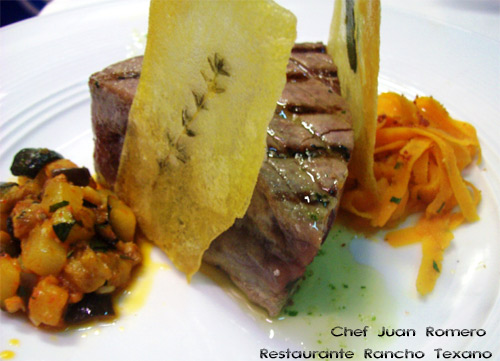 El restaurante madrileño Rancho Texano ha estrenado la nueva carta de la temporada, y su chef, Juan Romero, nos muestra uno de los nuevos platos que ha creado para ella compartiéndola en nuestra sección de Recetas de los chefs, se trata del Atún de almadraba con pisto de berenjena y calabacín, tallarines de zanahoria y patatas espejo.
