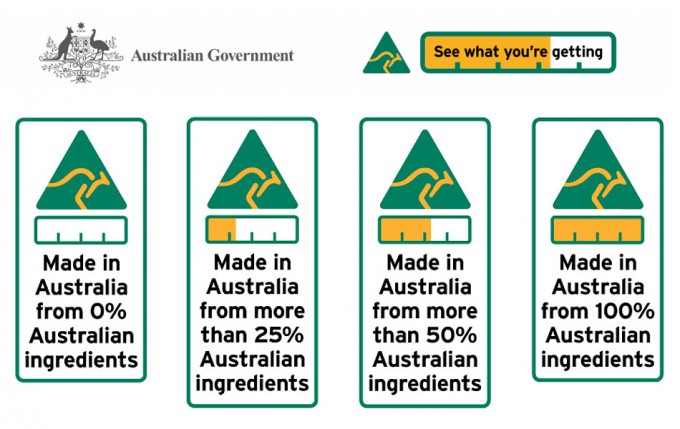 Los alimentos cultivados, producidos y elaborados en Australia que integren materias primas de otros países contarán con el logotipo del canguro, así como un gráfico segmentado por porcentajes con el contenido de ingredientes originarios del país. Los productos alimentarios que se envasen, congelen o se manipulen en Australia incluirán un gráfico con el porcentaje de ingredientes importados ya elaborados y que han sufrido modificaciones antes de ponerlos a la venta en las tiendas del país. Los alimentos importados que no sufren ningún cambio mostrarán claramente su procedencia sin que pueda dar lugar a dudas, con un recuadro en el que se indicará el país de origen.