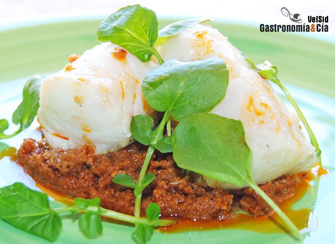 Sirve la salsa balandra en el centro del plato y coloca encima el bacalao, termina con unas hojas de berro y dejando caer un poco de aceite de la salsa. Sirve enseguida y ¡buen provecho!