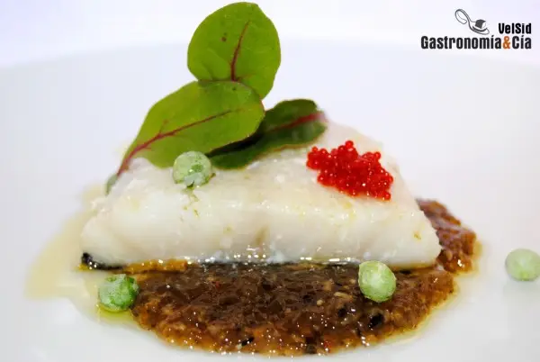Sirve como base del plato la tapioca de nori, coloca encima el bacalao aderezado con unas gotas de aceite de oliva virgen extra. Para decorar y aportar otras texturas al plato, reparte los guisantes liofilizados, las huevas de lumpo y los brotes de acelga roja aliñada. ¡Buen provecho!
