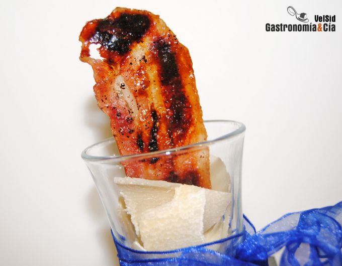 Este es un aperitivo para darse un capricho, energético, atrevido, el Bacon crujiente con jarabe de arce es un bocado que te provocará un festín de sabores en el paladar. La idea es poner una loncha por comensal, acompañada con unos colines o palitos de pan y si gustáis, con unas lascas de parmesano como se presenta en la fotografía.