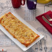 Enciende el horno a 220º C con calor arriba y abajo. Corta la masa de hojaldre por la mitad, longitudinalmente, para obtener dos bandas, prepara ambas igual. Extiende la lámina de hojaldre sobre papel vegetal, pínchala con un tenedor para que no suba durante el horneado, pero sin llegar a los bordes, y colócala en la bandeja del horno.