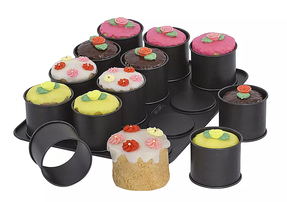 Si os gusta más presentar pastelitos individuales que una porción de un pastel o de una tarta grande, hemos encontrado un molde que os va a encantar, ya lo veis en las fotos que ilustran estas líneas, y comprobaréis que más que un molde es una bandeja con 12 moldes para hacer pastelitos individuales, y los moldes son desmontables, por lo que será muy fácil desmoldar los bizcochitos una vez hechos.