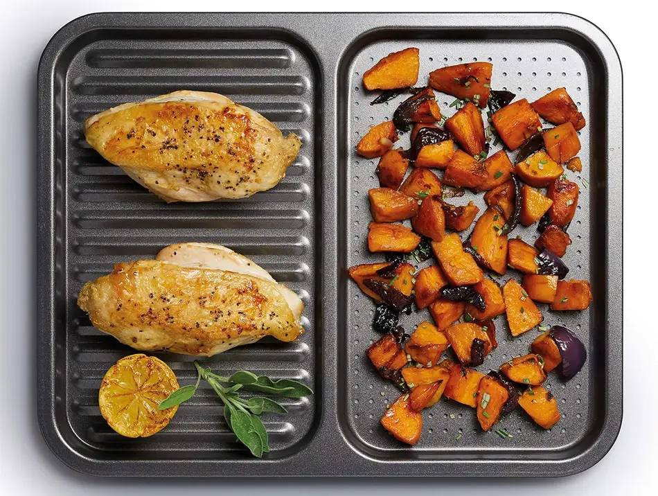 En resumen, la bandeja de horno doble es útil para ahorrar tiempo al permitir cocinar dos recetas diferentes a la vez, sin mezclar ingredientes ni sabores. Además, facilita que los alimentos reciban el calor de manera más uniforme, lo que favorece que la cocción sea también pareja.