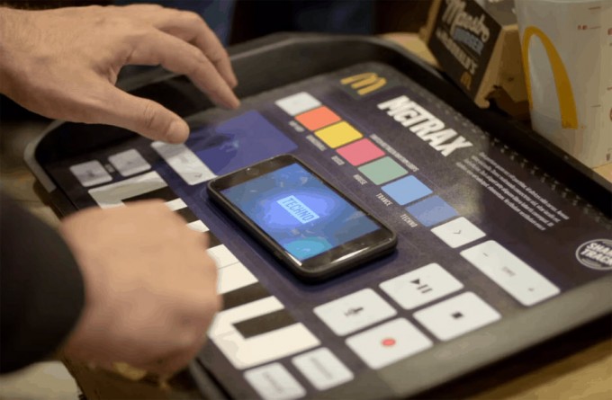 La bandeja de servicio de McDonald’s convertida en estudio de grabación ha sido creada por la agencia TBWA y la empresa Noboko, especialista en el desarrollo de aplicaciones tecnológicas. Según explican los creadores, el teléfono funciona como un altavoz, todas las funcionalidades están integradas en el mantel que trabaja asociado a una app. El mantel se denomina McTrax y como decíamos, se debe descargar la aplicación en el teléfono para poder crear la música con sintetizadores, bucles de audio, efectos musicales, etc.