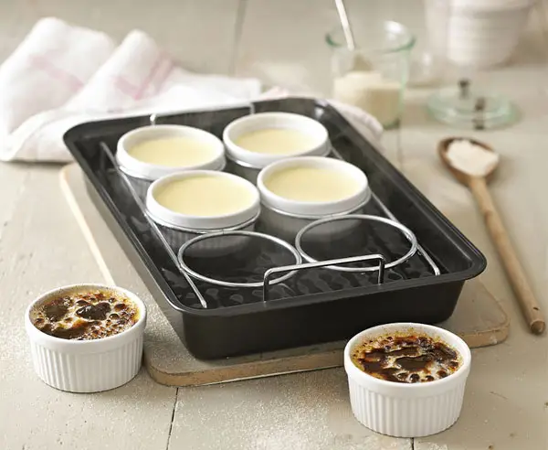 Nos parece una idea perfecta esta bandeja para baño maría de muchos de nuestros postres que precisan este método de cocción en el horno, en realidad se trata de un kit que incluye la bandeja, un soporte y los ramequines, ya sabéis que éstos son recipientes muy útiles, hay en formato grande y formato individual, y son ideales para presentar soufflés, flanes, la tradicional crème brulée o el delicioso coulant de chocolate.