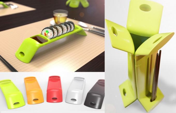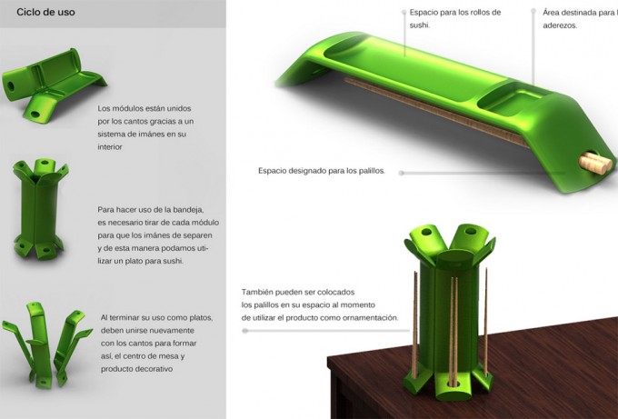 El creador de estos platos para sushi convertibles en un elemento decorativo es el mexicano Jorge Alberto Treviño Blanco, ha diseñado este ‘dos en uno’ con la idea de ofrecer un utensilio de mesa práctico y que a su vez no sea un engorro para guardarlo en el armario de la cocina. Ofrece además la idea de poder formar el elemento decorativo con distinto número de piezas, es decir, si en un hogar hay cinco personas, se puede disponer de cinco bandejas y todas unidas formarán una especie de jarrón para el centro de la mesa. Del mismo modo será si la familia se compone de tres personas, pues tres piezas también pueden formar el elemento decorativo.