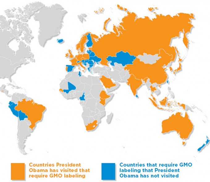En el mapa que podéis ver aparecen en color naranja los países visitados por el presidente estadounidense en los que se requiere el etiquetado transgénico, en azul aparecen los países no visitados que también requieren la identificación de los alimentos modificados genéticamente. En EWG (Environmental Working Group), organización sin ánimo de lucro que se dedica a la protección de la salud humana y del medio ambiente, se hacen eco de esta promesa incumplida y con cierta ironía argumentan que el presidente Barack Obama viaja a los países en los que los ciudadanos sí saben lo que contienen sus alimentos.