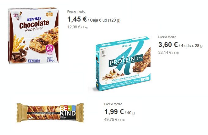 Las barritas más económicas son las de cereales, y haciendo una revisión rápida consultando internet, podemos ver que el precio/kilo de unas barritas de Mercadona simples puede rondar los 12 euros, mientras que las barritas proteicas o energéticas pueden rondar los 30-50 euros/kilo, como podéis ver en la foto superior. ¿Merece pagar esos precios habiendo opciones más saludables, deliciosas y significativamente más económicas?