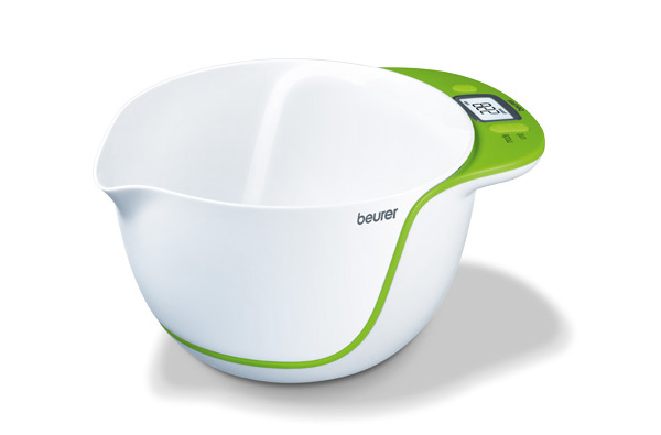 Esta báscula de la marca Beurer (es muy fácil de utilizar, tiene capacidad para 2’5 litros, como es desmontable, cuando se pone el bol en el soporte que toma el peso, hay que ponerlo a cero (función de tara) para empezar a pesar los ingredientes que se introduzcan en él. Cada ingrediente que deba añadirse deberá pesarse desde cero otra vez.