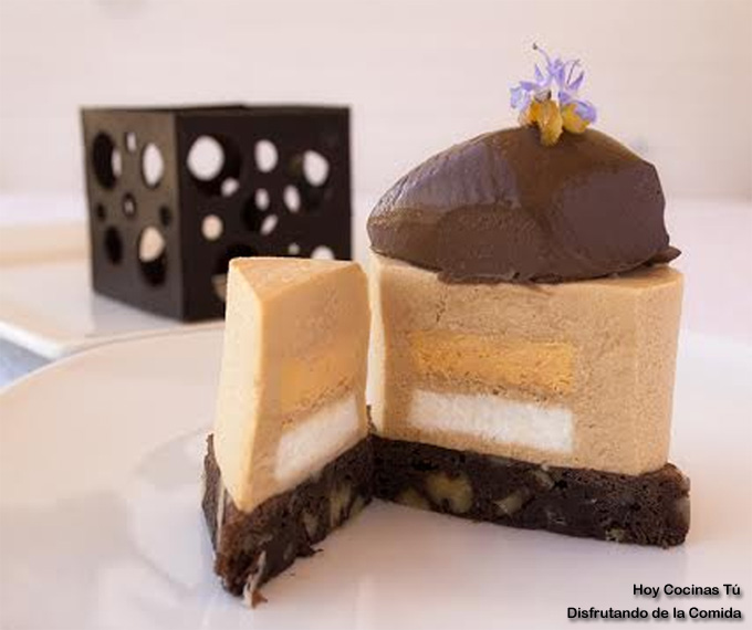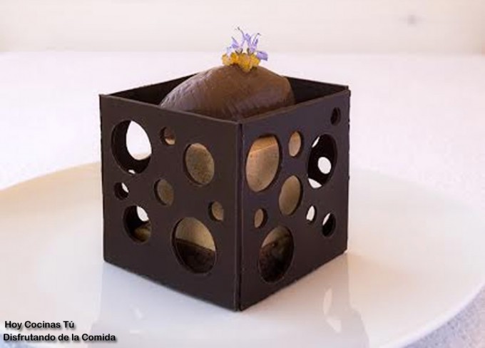 Roberto ha elaborado un brownie como base, sobre el que coloca una bavaroise de caramelo, con interior de crema de naranja y mousse de Grand Marnier. Coloca un cremoso de chocolate y romero y decora con unos dados de naranja confitada y flores. Como podéis ver en las fotos, esta joya de pastelería se encierra en una caja de chocolate. La presentación es preciosa, pero la degustación debe ser sublime.