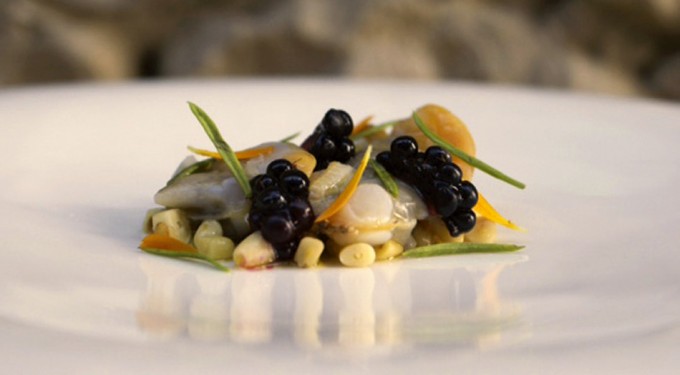 Sobre estas líneas podéis ver otra de las creaciones culinarias del cocinero de La Casona del Judío, Sergio Bastard, y a continuación podéis acceder a la receta, el plato se llama Berberechos ahumados con pino, piñones, hinojo marino, moras, emulsión de piñón y pimienta rota. Prácticamente está dicho todo lo que incorpora.