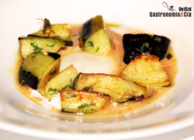 Pelamos la berenjena dejando unas tiras de piel alternas. Cortamos en trozos más o menos del mismo tamaño pero de formas distintas. Ponemos a calentar el aceite de oliva en una sartén de paredes altas hasta los 170º C. Freímos la berenjena no más de un minuto, que coja un color dorado por fuera. Colamos y la pasamos a otra sartén sin aceite, añadimos el ajo frito, el shiso picado y una pizca de sal. Salteamos unos 15 segundos.