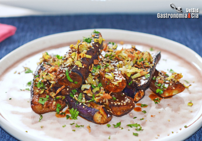 Sirve en el plato las berenjenas glaseadas con toda la salsa que haya quedado y reparte a continuación el puerro, la cebolla frita crujiente, el cilantro y las semillas de sésamo. ¡Buen provecho!