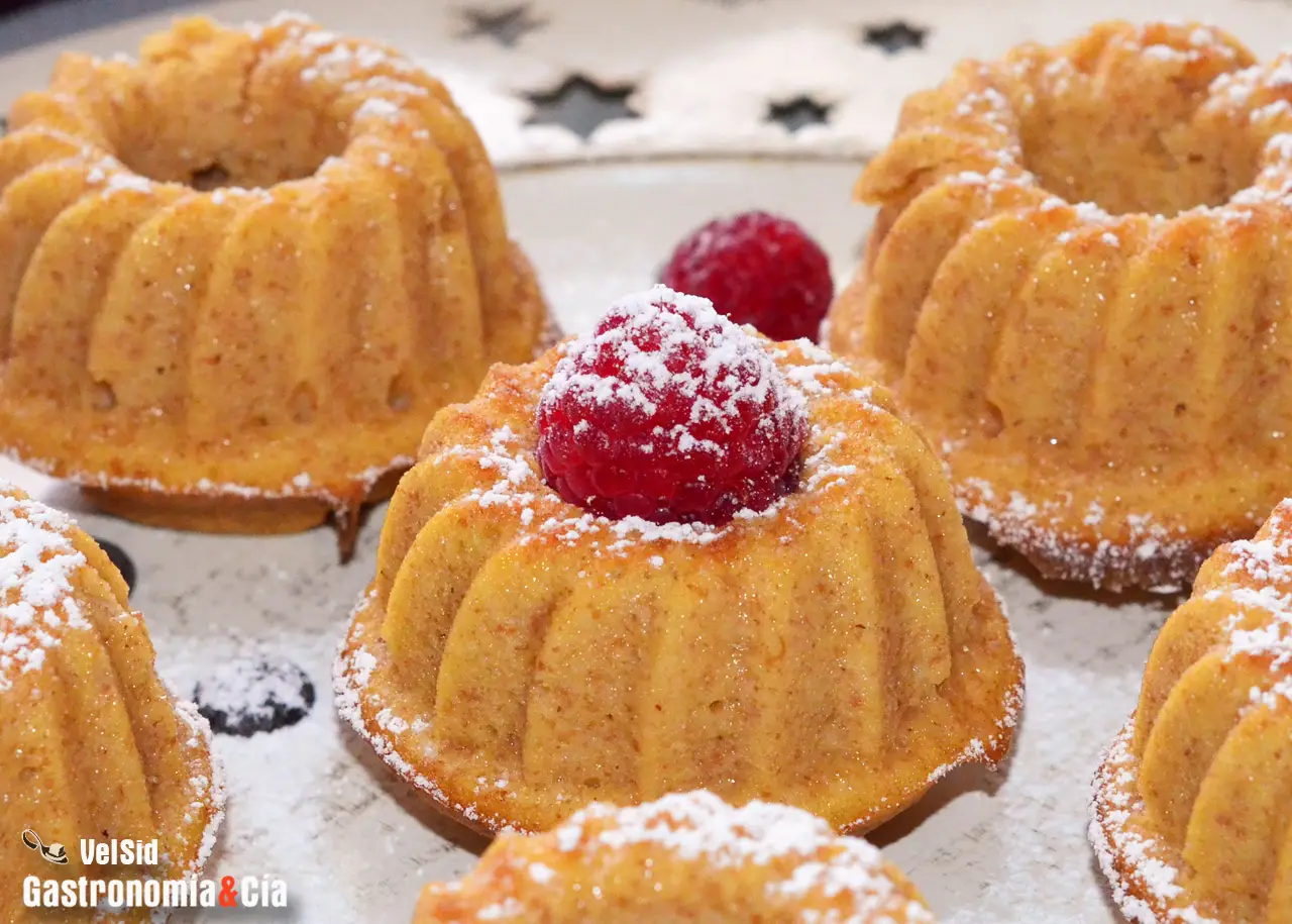 Hornea los pastelitos colocando la bandeja a media altura, durante 20 minutos aproximadamente, ya que dependiendo del tamaño de los bizcochitos, del material del molde y del horno, se puede ir unos minutos arriba o abajo. Comprueba la cocción pinchando con un palillo. Deja enfriar antes de desmoldar.