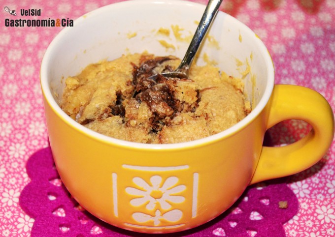 Introduce la taza en el microondas y programa dos minutos y medio o tres a 800W. El tiempo puede variar según el microondas, como sucede con los hornos. Es mejor quedarse corto que pasarse y que el bizcocho quede seco. Puedes comprobar la cocción del bizcocho con un palillo de madera.